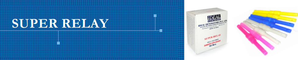 Super Relays consists of two delay devices assembled in a plastic component. Two holes are provided at either ends for threading the Detonating cord. For identification, different colored plastic components are used for different delay intervals.Super Relays can be used to provide delay initiation patters such as row delay, diagonal pattern, V-pattern etc. Super Relays can be used in such a manner that only one hole blast at a time thus keeping the maximum charge per delay.